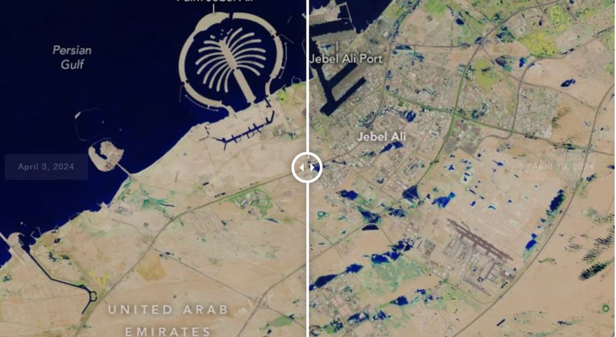 Reshjet e paprecedenta dhe të rrëmbyeshme zhytën nën ujë disa pjesë të Emirateve të Bashkuara Arabe javën e kaluar, duke regjistruar përmbytjen më të madhe të regjistruar në 75 vjet. Dy ditë pas rënies së shiut, sateliti Landsat 9 kaloi mbi Emiratet e Bashkuara Arabe të premten, më 19 prill, dhe kapi imazhe të pellgjeve të mëdha me ujë. Pellgjet me ngjyrë blu të thellë në imazhet e publikuara…
