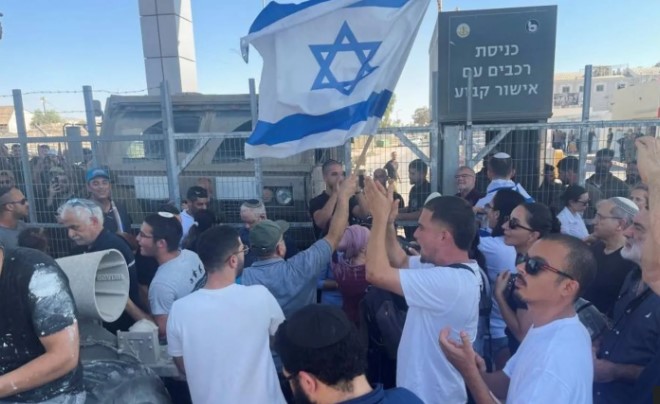 Të hënën dhjetëra protestues, duke përfshirë deputetë të ekstremit të djathtë nga koalicioni qeverisës i Izraelit, shpërthyen nga porta e bazës ndërsa të tjerët u përpoqën të ngjiteshin nga gardhi, duke brohoritur “ne nuk do t’i braktisim miqtë tanë, sigurisht jo për terroristët”.