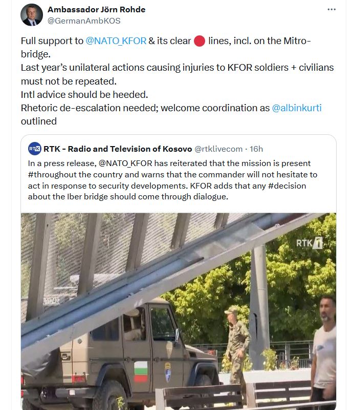 Ambasadori i Gjermanisë në Kosovë, Jorn Rohde, tha se këshillat e ndërkombëtarëve duhet të merren parasysh dhe se nevojitet de-përshkallëzimi i retorikës. “Mbështetje të plotë për NATO-n dhe linjat e tyre të kuqe për urën në Mitrovicë. Veprimet e njëanshme të vitit të kaluar kanë rezultuar me plagosje të ushtarëve të KFOR-it dhe civilëve, dhe kjo nuk duhet të përsëritet. Duhet të merret parasysh…
