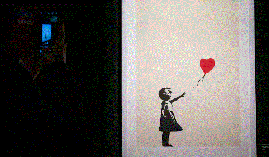 Në vitin 2018, një kopje e kornizës së veprës artistike mori më shumë se 1 milion paund përpara se të vetëshkatërrohej në skenë. Pak çaste pasi ra çekiçi, u dëgjuan alarmet dhe telajo ra përmes një grirëse të fshehur të ndërtuar në fund të kornizës së madhe të zbukuruar.